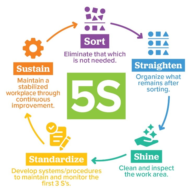 5S is a Lean management system for keeping a clean, organized, and efficient workspace guided by five basic visual controls:
